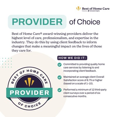 The Best of Home Care awards are given by Activated Insights to recognize the top performing home care agencies in the U.S. The awards are given based on overall client satisfaction scores that are determined by surveys that are submitted by home care recipients and their families as well as caregivers who work for home care agencies. The Provider of Choice award is given to home care agencies who consistently provide their clients with a high standard of care and the Employer of Choice award is given to agencies that value and recognize the contributions of their caregivers. The requirements for both awards include an overall satisfaction score of 8.75 and a minimum of 12 completed surveys in the previous 12 months.