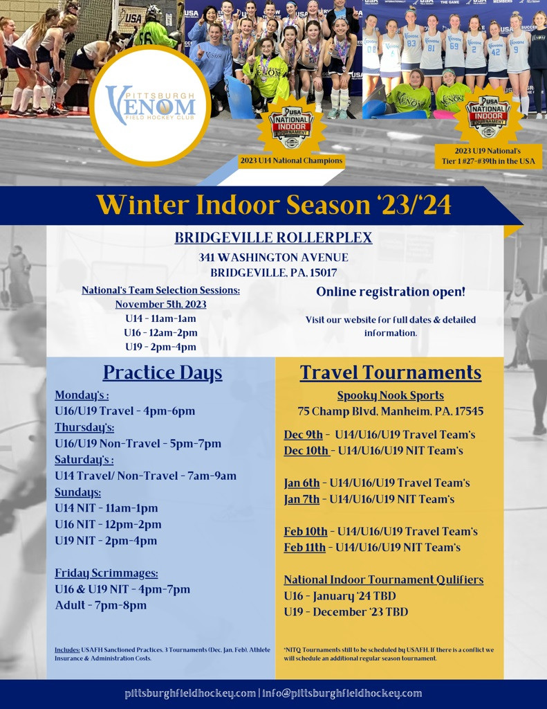 The Pittsburgh Venom Field Hockey Club, based in Carnegie, PA, is thrilled to announce the launch of its winter indoor season. Registration is now open for field hockey enthusiasts eager to join this premier club. Notably, one of its U19 teams recently achieved Tier 1 status at Nationals, ranking among the top 26th-39th teams in the USA. Additionally, the club's U14 team secured the National Indoor Tournament Championship last year.